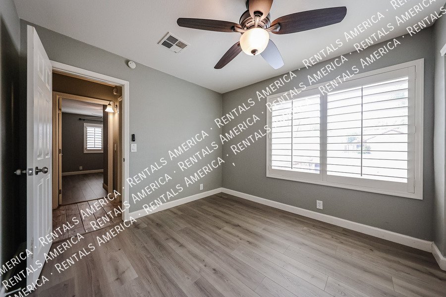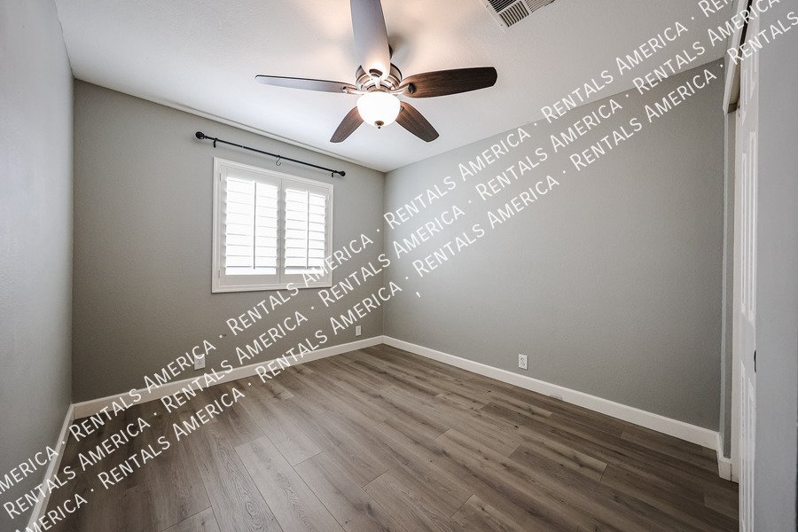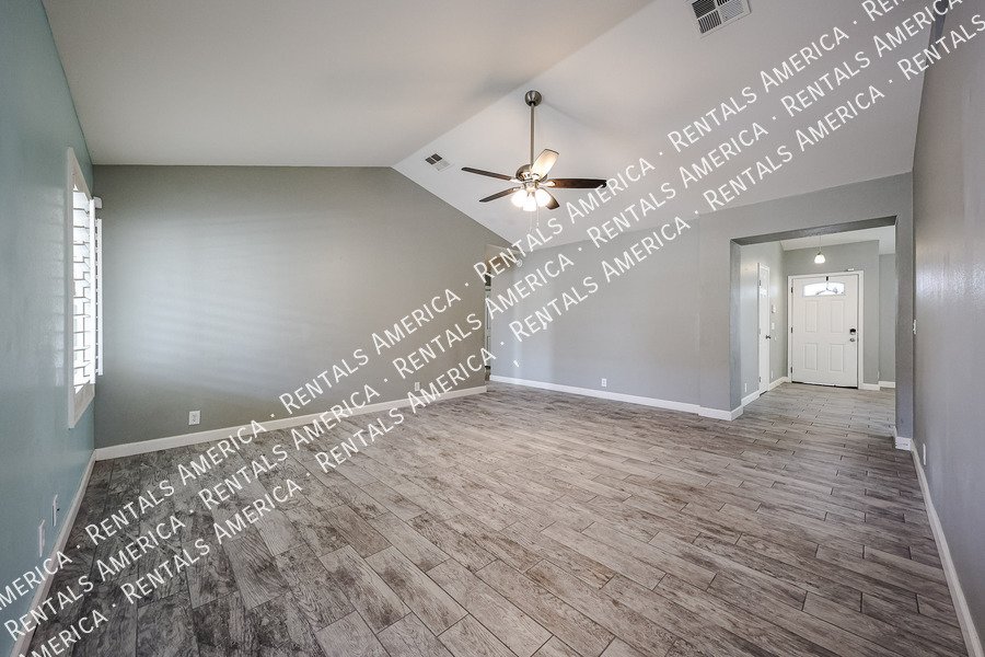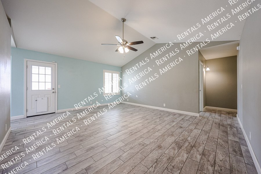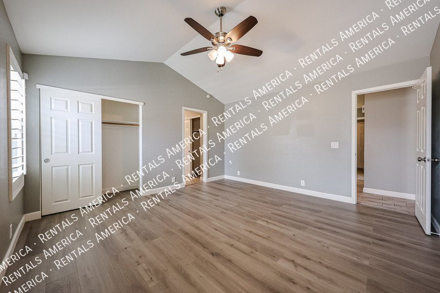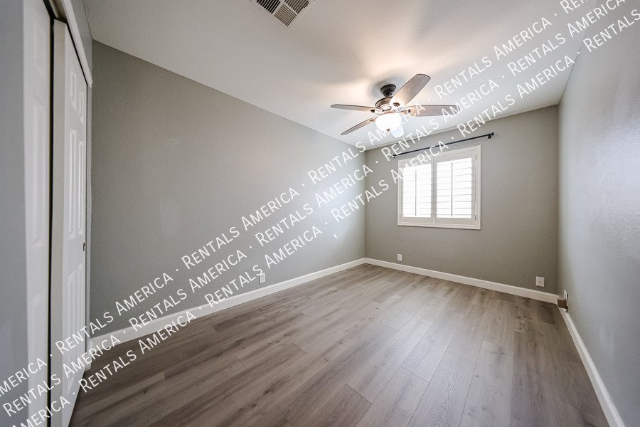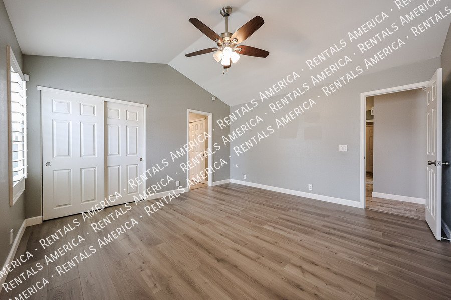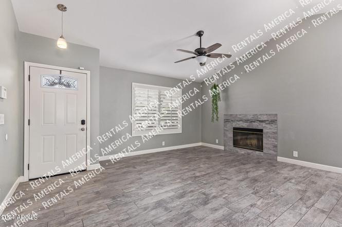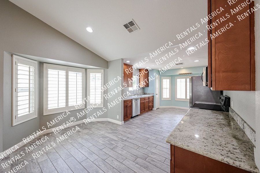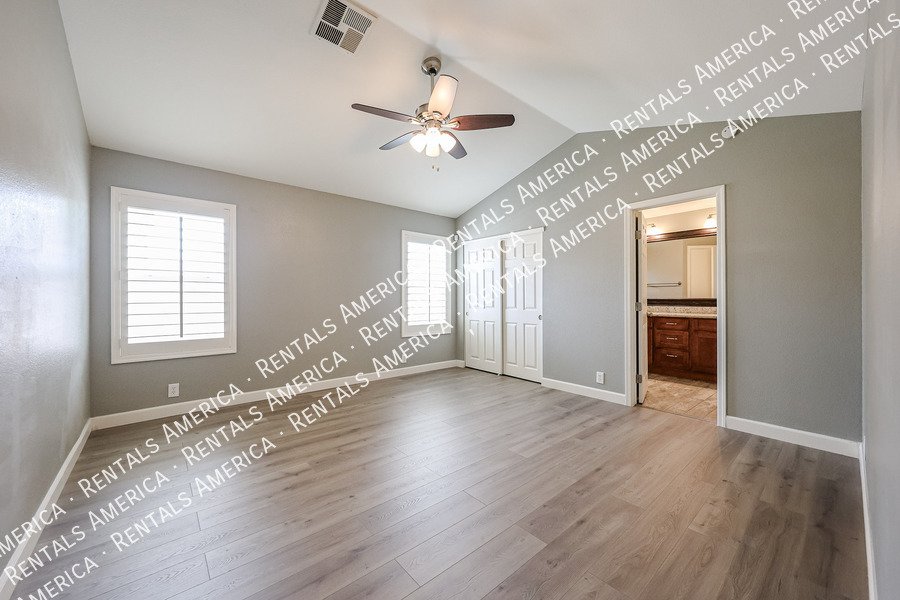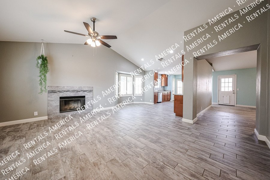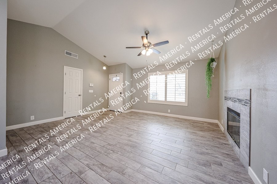 Feel at home with this charming 4-bedroom home that is sure to captivate with its elegant interior, featuring vaulted ceilings, wood shutters throughout and wood-look tile floors. The spacious great room, complete with a cozy fireplace, creates a warm and inviting atmosphere. The kitchen is a cook's delight, equipped with chocolate-stained cabinets, stainless steel appliances, granite counters, a handy pantry, and a delightful bay window. Retreat to the serene main bedroom, offering a private bathroom with dual sinks for convenience. The peaceful backyard is perfect for relaxation, boasting a covered patio, a lush grassy area, and ample space for outdoor activities. *One Time Admin Fee: $300, Pet Deposit: $300/pet (if applicable), Service Fee: 2%. $39/month Resident Benefits Package* Helping Heroes Discount Available! ONE DOG 35LBS OR LESS OKAY.