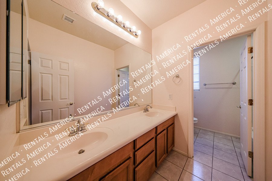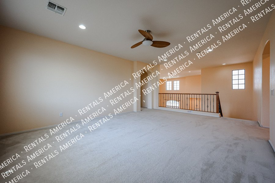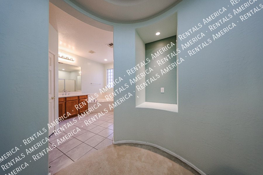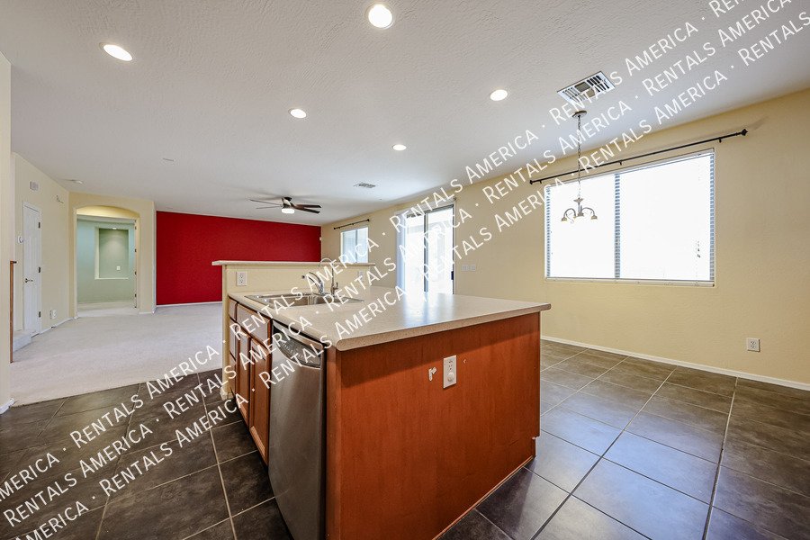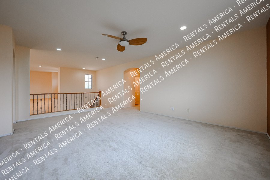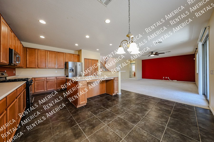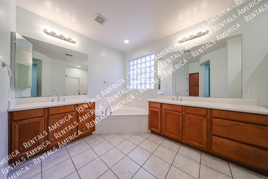 Very nice open layout includes large living/dining room leading to family room and eat-in kitchen. Kitchen features dining nook, oversized island w/ raised breakfast bar, stainless appliances, gas range, built-in microwave, recessed lighting and plenty of solid hardwood cabinets. Downstair Primary Suite has a walk-in shower, garden tub, two vanities, private toilet room and large walk-in closet. Upstairs large center loft w/ recessed lighting and view of lower level. Lighted ceiling fans throughout. 3-Car Garage. Mountainous views and easy access to shopping, entertainmet and South Mountain.