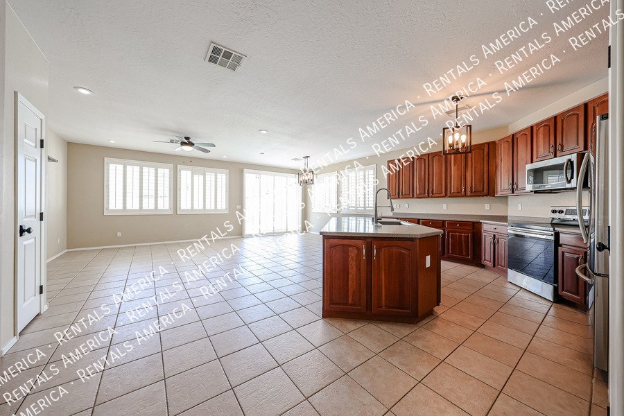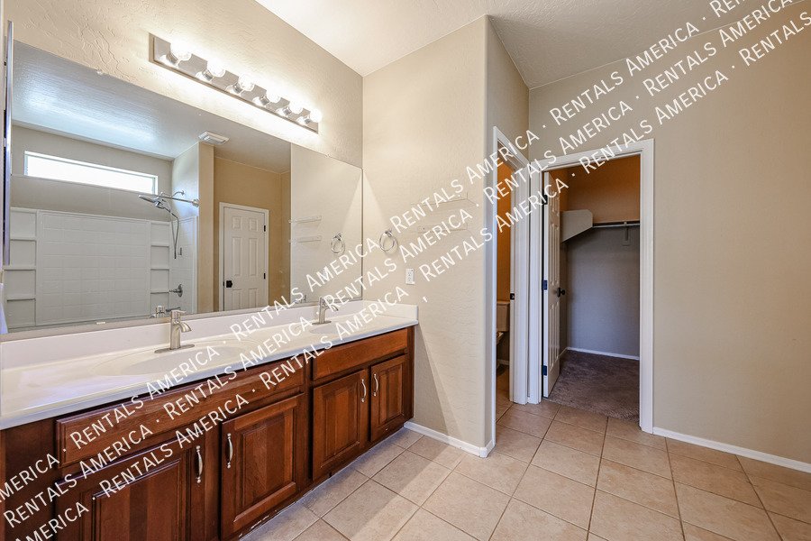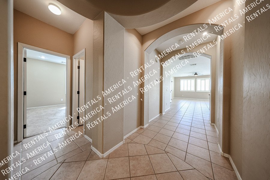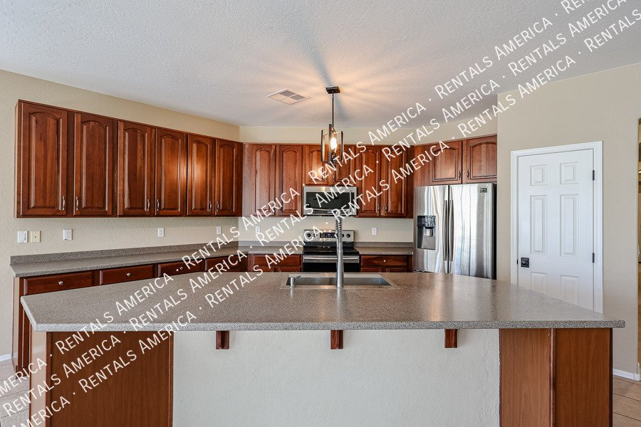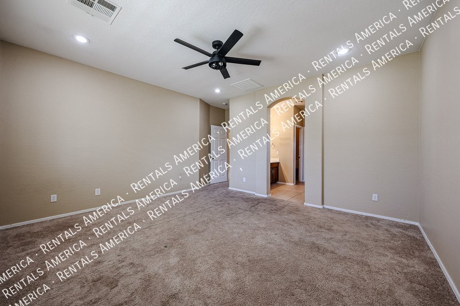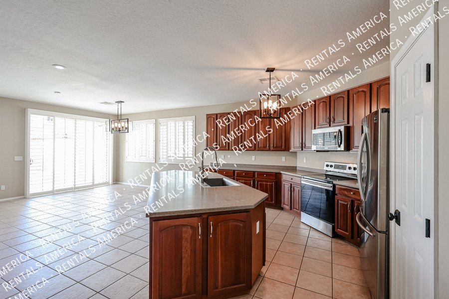 Spacious 4-bedroom, 2-bath home plus a versatile den/formal living room, offering over 2,100sq ft of living space. Features include upgraded kitchen cabinetry, large island, pantry, tile in main areas, and plush carpet in bedrooms and den. The primary suite boasts double sinks, a private toilet room, and a walk-in closet.