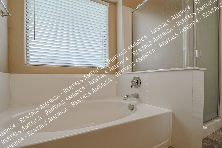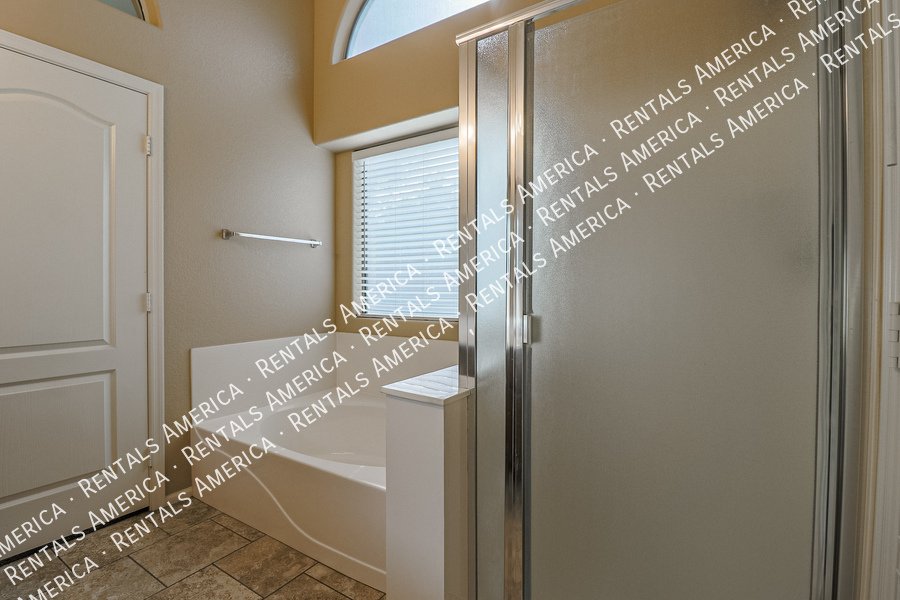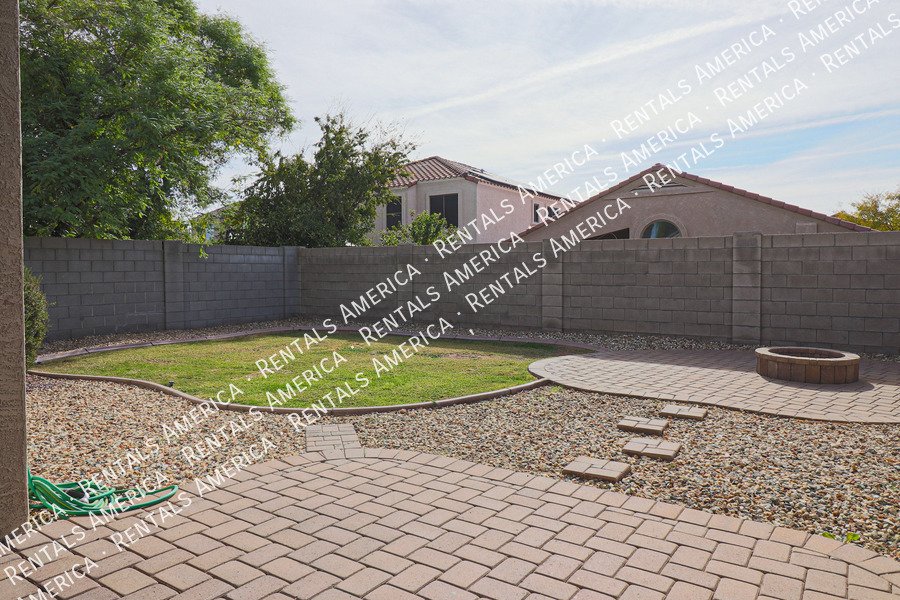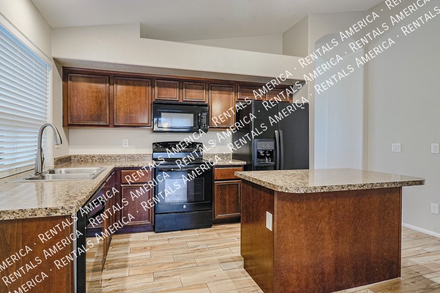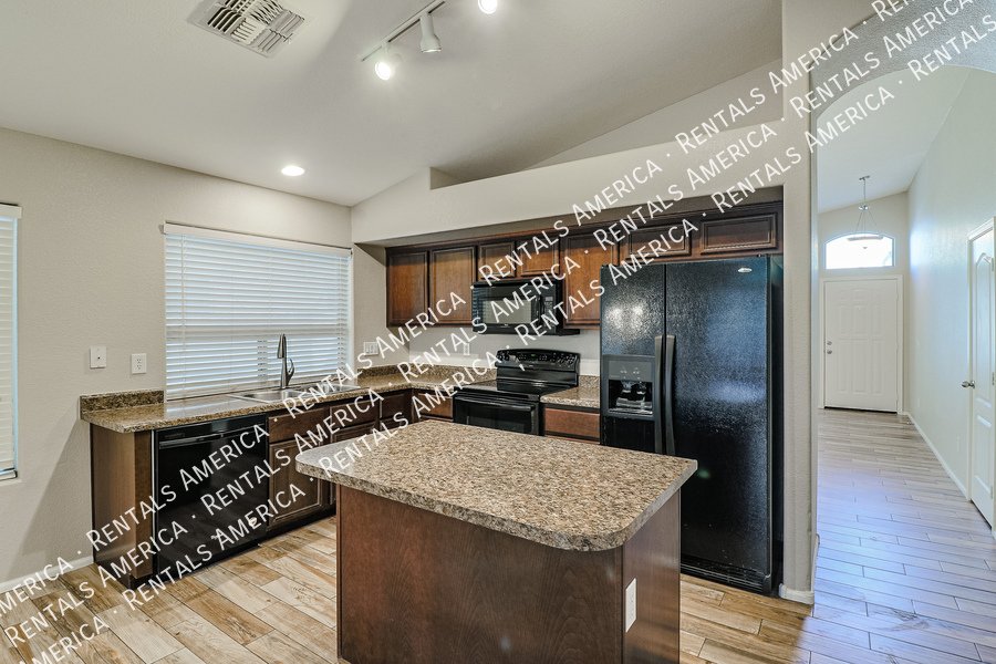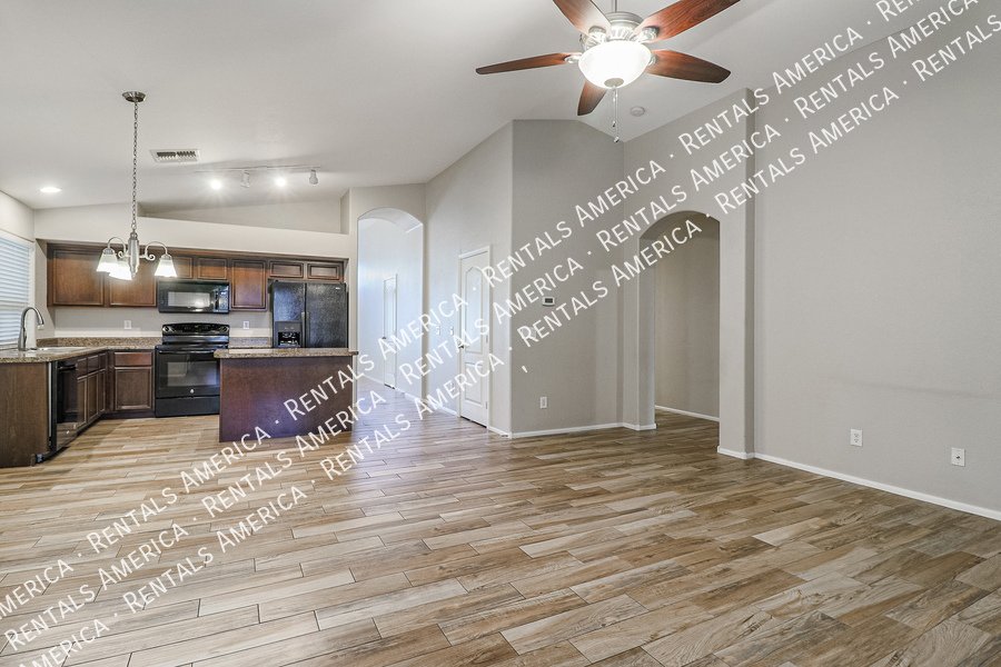 Coming Soon! Available 10/24, please Do Not disturb the occupants! Beautiful open layout formal living / kitchen at entry leads to kitchen, then family room with side access to back yard. Kitchen features island w/ breakfast bar, all black appliances, built-in microwave rich, dark cabinetry and dining area. Large family room w/ side access to functional back yard with a covered paver patio, open paver patio w/ firepit and bordered grass area. Owner suite includes spacious bedroom, walk-in closet, double sink vanity, garden tub, walk-in shower and back patio access. Attractive plank tile in all livable areas. Carpet in all bedrooms. Vaulted ceilings, recessed lighting, updated fixtures and ceiling fans throughout. Carpet cleaning scheduled.