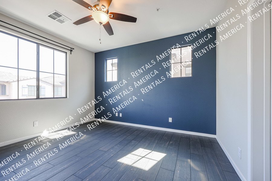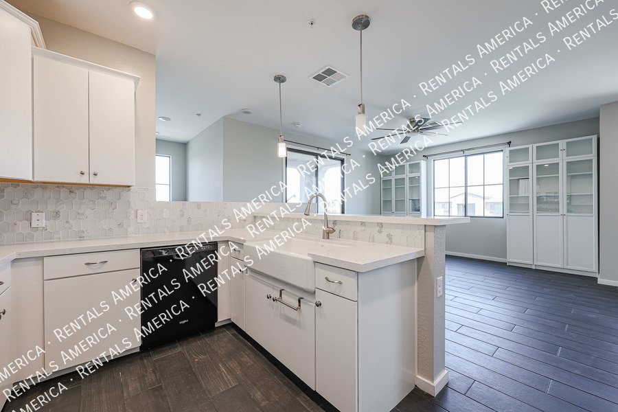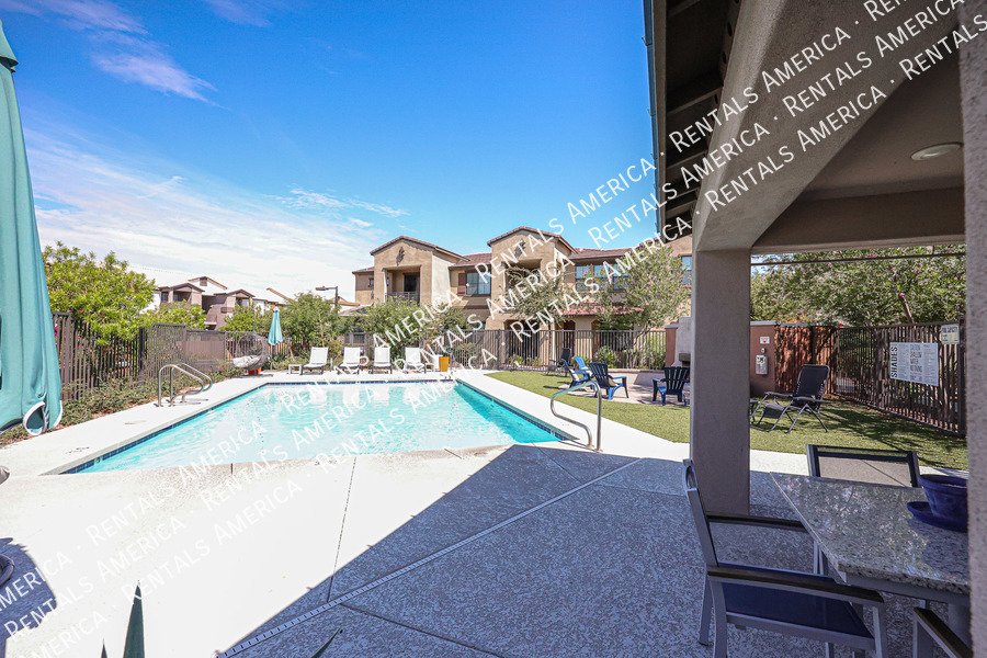 Tucked away in a newer and well kept gated complex, this 2 bedroom has all of the upgrades. Master bedroom comes with built in storage wall unit with a blue accent wall and a large closet. Master bathroom has a gorgeous tiled shower with double vanities. Overhead lighted fans in all rooms, tiled wood plank flooring throughout. Built in wall unit in the living room, Corian countertops in kitchen and bathrooms. All appliances included. 1 car garage. Lots of storage space. Resort style pool with its own bathroom and fabulous sunset views off of the balcony to complete your day. 1 dog under 20lbs. considered.