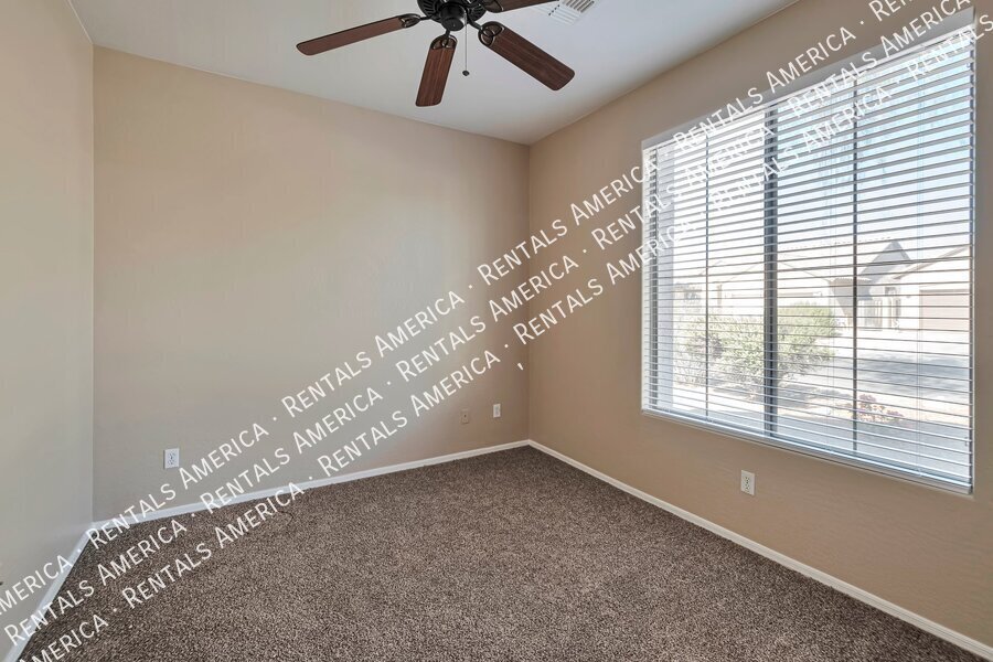 Split floor plan features ceramic tile in all the right places, entertainment and art niches, decorative gas fireplace in living room, over sized tub and separate shower in master bath with double sinks, large walk-in closet, 2-inch faux wood blinds throughout and ceiling fans, oak cabinets in kitchen, baths and laundry room. French Doors out of living room to an oversized covered patio. Professionally landscaped front and back yards. Enjoy Johnson Ranch Community, which offers numerous playgrounds and community pool. New paint, carpet, and appliances. Available NOW!!!