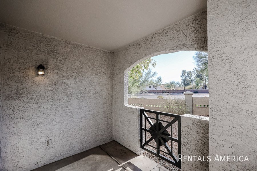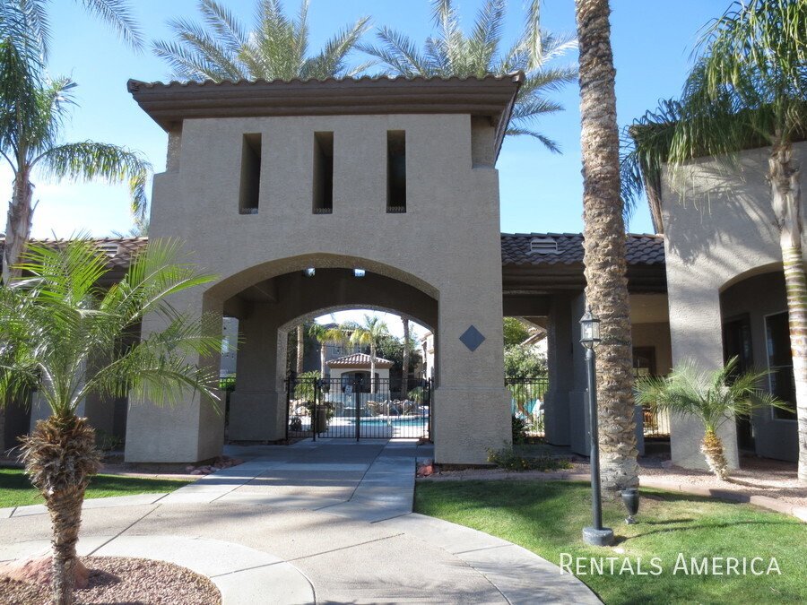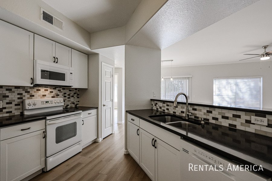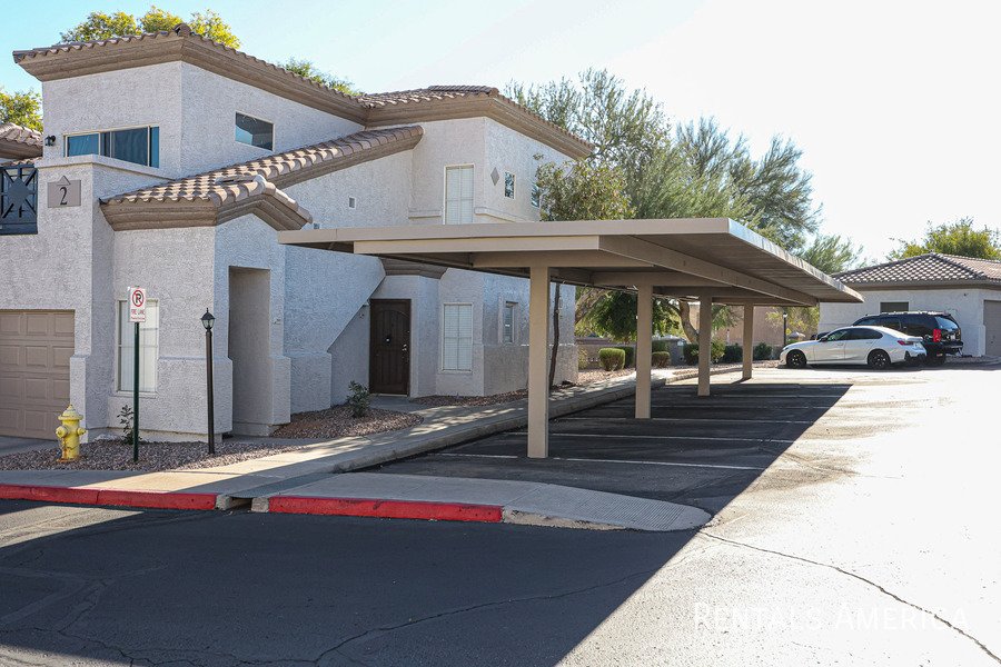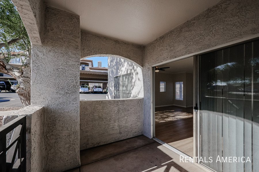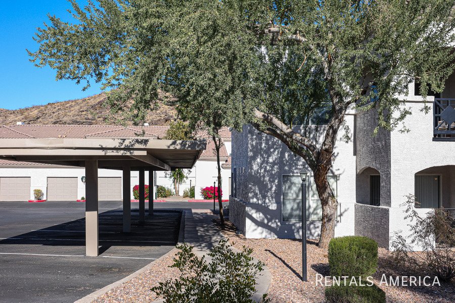 Spacious Ground Level One Bedroom Townhouse with Direct Entry from Extra Deep Garage has Cool North/South Exposure & a Shady Covered Patio. This Nice End Unit has new flooring, new paint, updated kitchen and bathrooms. Lots of kitchen cabinets with glass backsplash. Ceiling Fans & 2" Blinds Throughout. All Appliances Are Included along w/ Water/Sewer/Trash! Master Size Bedroom Features Dual Entry, Dual Sinks, Oval Tub w/ Travertine Surround, Lg Walk-In Closet. Nice Conveniences Like Storage Areas, Extra Parking Nearby. Enjoy Mountain Canyon's Multiple Pools, Spas & Club House PLUS Mountain Park Ranch Amenities, Sport Courts, Miles of Trails & Mountain Views. Just 3 minutes from the I-10 for Quick Access to Work or Play. Excellent Shopping and Dining all along Chandler Blvd--even within Walking Distance! See Today!