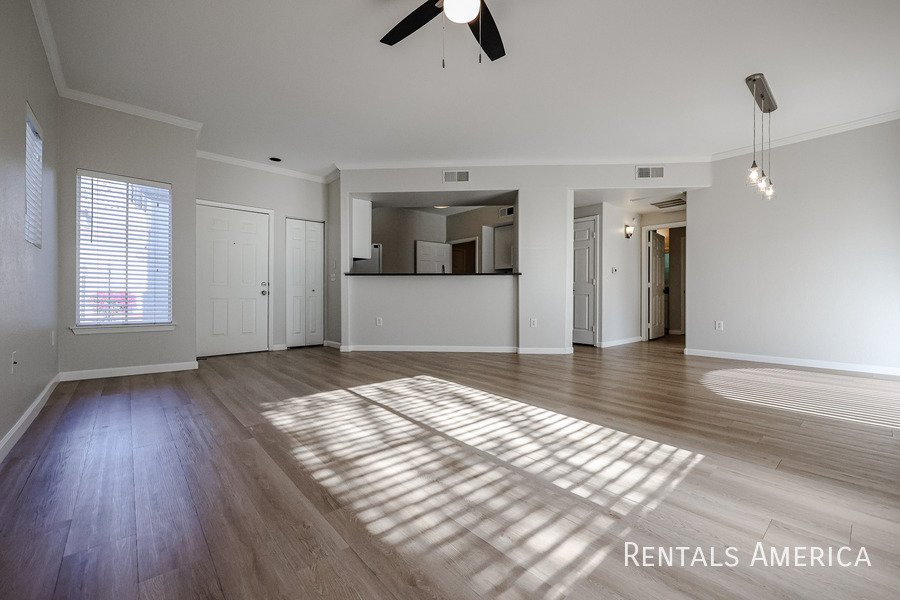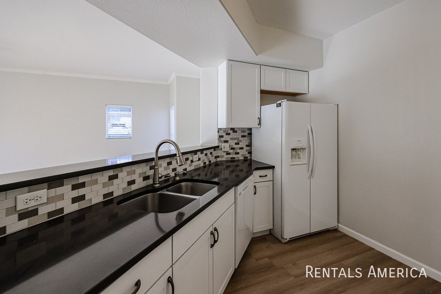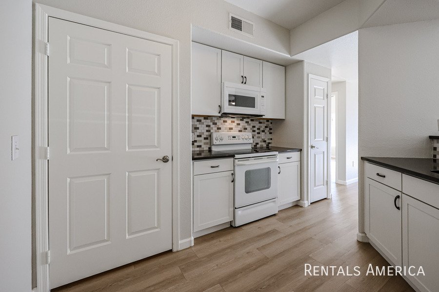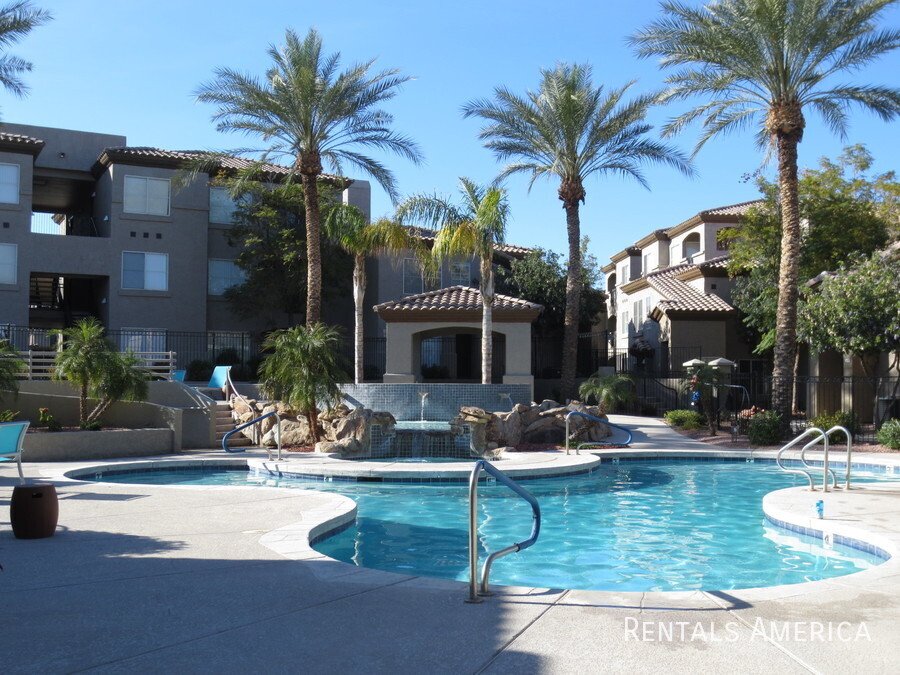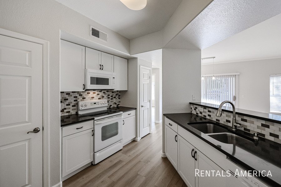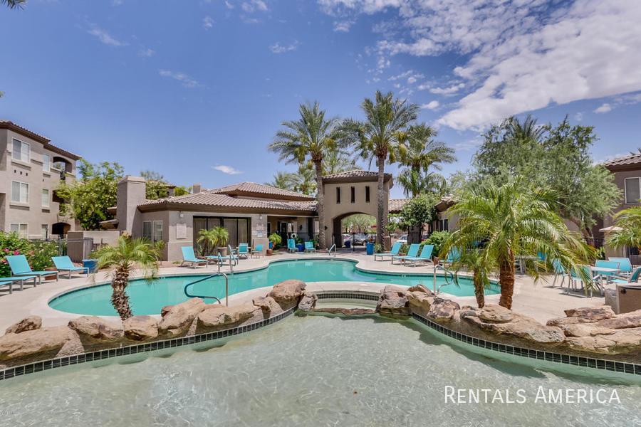 Spacious Ground Level One Bedroom Townhouse with Direct Entry from Extra Deep Garage has Cool North/South Exposure & a Shady Covered Patio. This Nice End Unit has new flooring, new paint, updated kitchen and bathrooms. Lots of kitchen cabinets with glass backsplash. Ceiling Fans & 2" Blinds Throughout. All Appliances Are Included along w/ Water/Sewer/Trash! Master Size Bedroom Features Dual Entry, Dual Sinks, Oval Tub w/ Travertine Surround, Lg Walk-In Closet. Nice Conveniences Like Storage Areas, Extra Parking Nearby. Enjoy Mountain Canyon's Multiple Pools, Spas & Club House PLUS Mountain Park Ranch Amenities, Sport Courts, Miles of Trails & Mountain Views. Just 3 minutes from the I-10 for Quick Access to Work or Play. Excellent Shopping and Dining all along Chandler Blvd--even within Walking Distance! See Today!